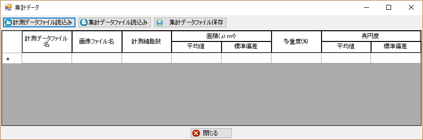 計測対象の画像ファイルをすべて計測してデータファイルを作成したら、それらのデータを集計します。