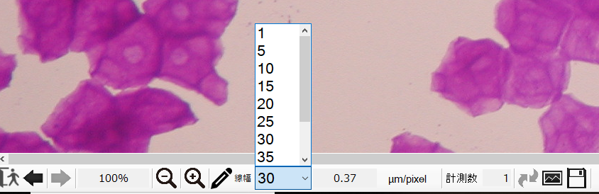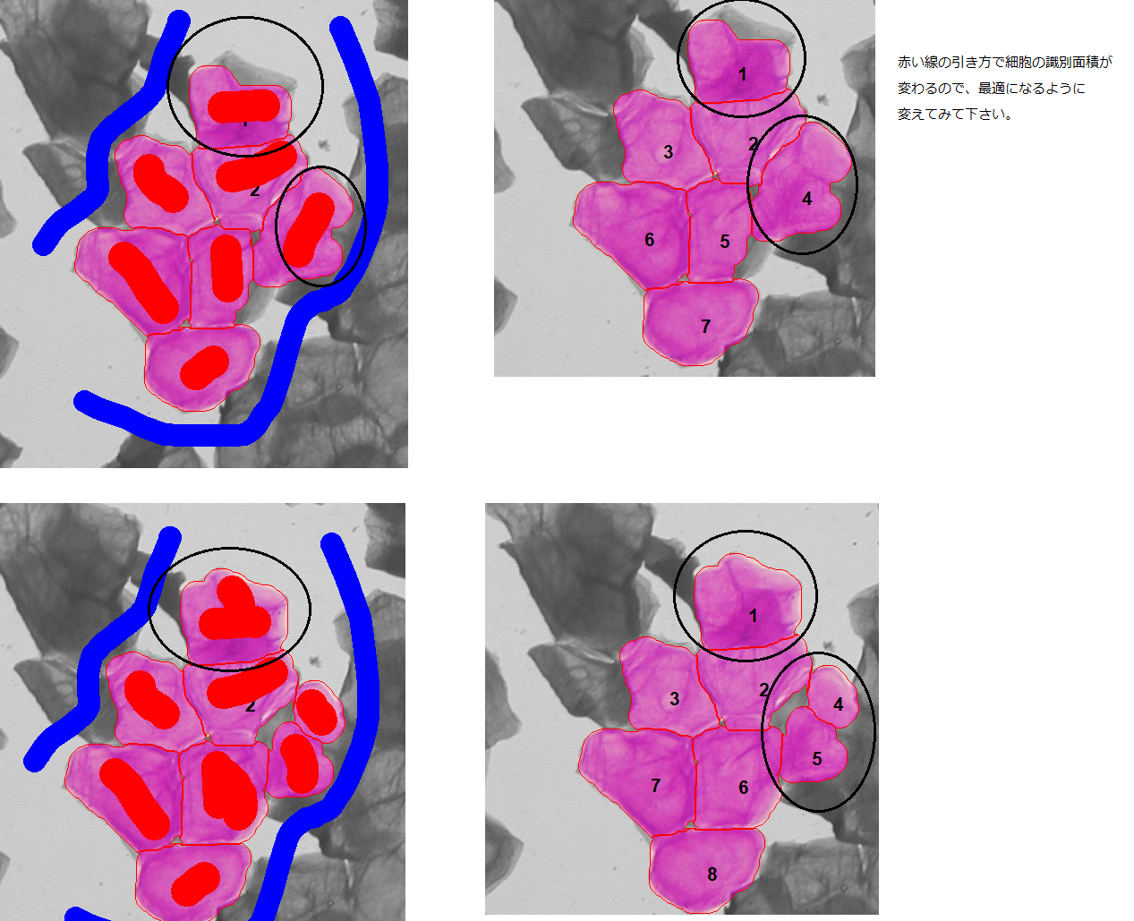 画面下部のツールバーに手がかり線の線幅設定があります。画像上の細胞の細かさに合わせて適宜変更してください。手がかり線の線幅を変えることによりクリックするだけで良くなる場合もあります。