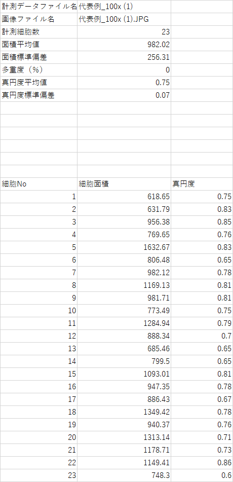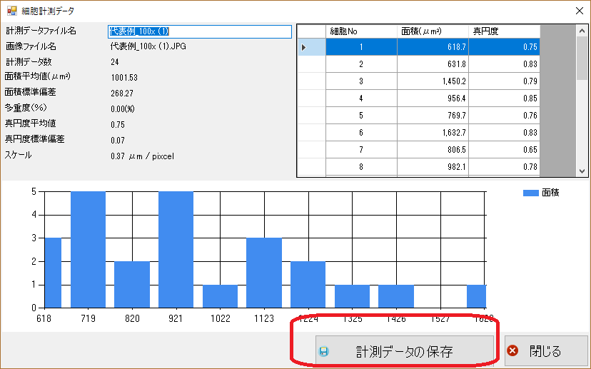 計測データウィンドウが表示されて各細胞の面積、真円度と面積ヒストグラムが確認できます。