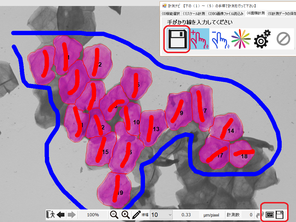 面積計測の際に指定する手がかり線(赤、青)はその情報をファイルに保存しておくことができます。