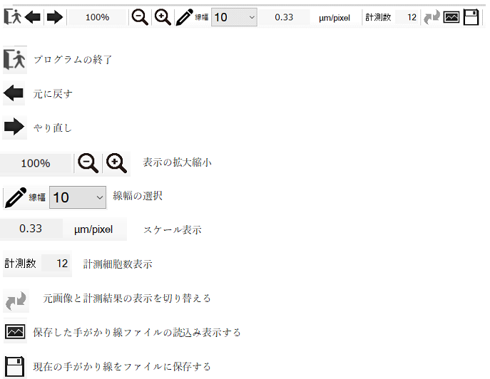 計測結果が表示されている状態から、計測する細胞を追加するために手がかり線を引くときは、手がかり線ボタンを押します。