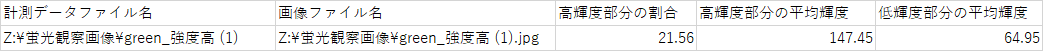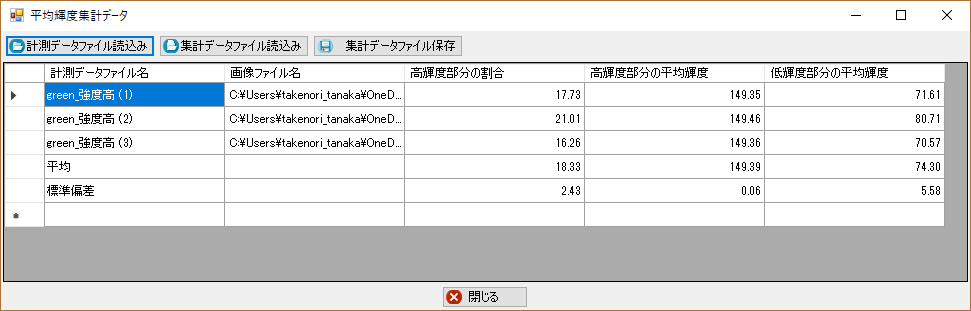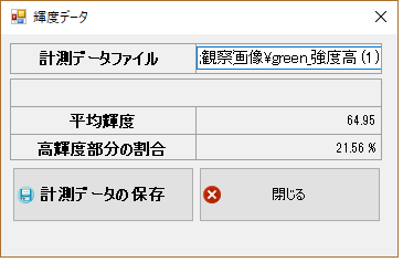 計測が終わると「輝度データ」ウィンドウが開きます。平均輝度と高輝度部分の割合が表示されます。