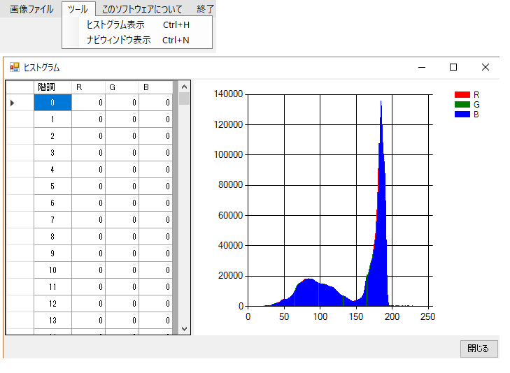 読み込んだ画像ファイルをグレースケールにした場合の階調でヒストグラムを表示します。